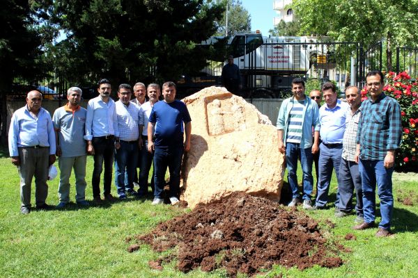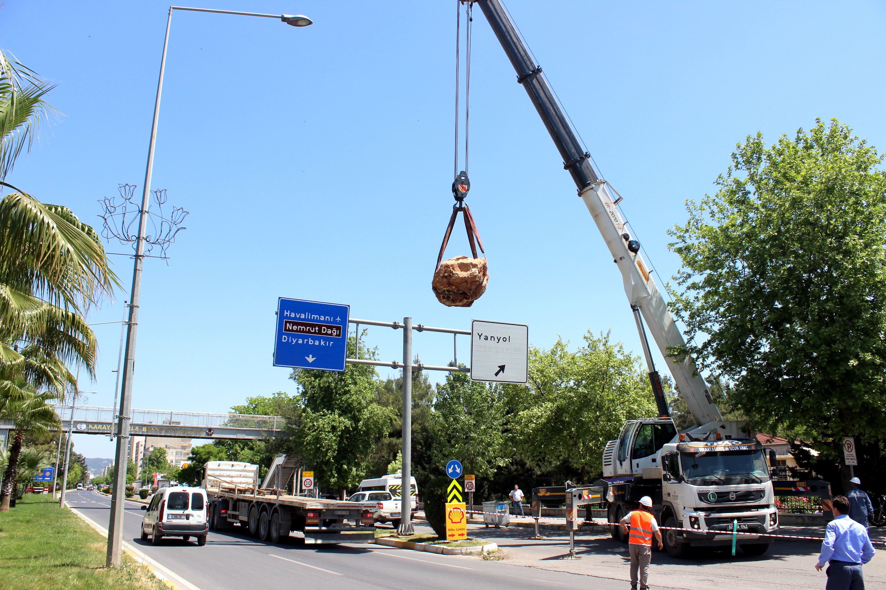 Adıyaman’da üzerinde Roma Dönemi'ne ait kabartma bulunan 8 tonluk dev kaya, vinç yadımı ile bulunduğu yerden alınarak Adıyaman Müzesi bahçesine yerleştirildi.