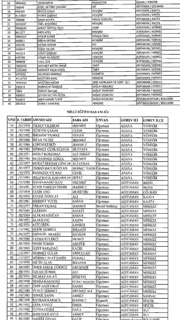 Resmi Gazete'de yayınlanarak yürürlüğe giren 675 sayılı Kanun Hükmündeki Kararname (KHK) kapsamında Adıyaman’da daha önceden açığa alınan milli eğitime bağlı 30, sağlığa bağlı ise 28 kişi olmak üzere toplam 58 kişi meslekten ihraç edildi.