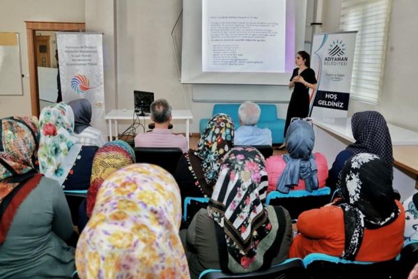 Psikolog Sena Nur Kılınç tarafından gerçekleştirilen eğitim programına Adıyaman Aile ve Sosyal Politikalar İl Müdürü Fehmi Çelik, Adıyaman Belediyesi Kadın ve Gençlik Merkezleri Yöneticisi Yasemin Delibaş ve kursiyerler katıldı.