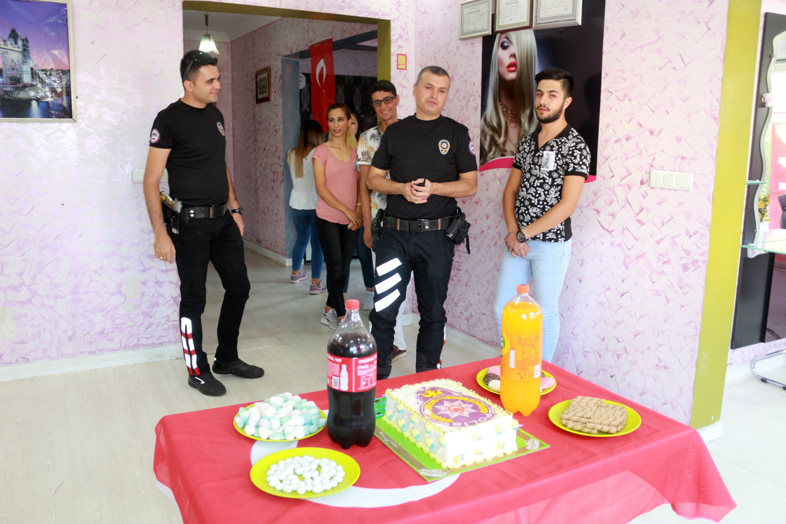 Bayan kuaförü Yusuf Aslan, iş yerinde yapılan hizmetlerin bütün şehit ailelerine, polis ve asker eşlerine ücretsiz olduğunu söyleyerek herkesi davet etti. Yapılan konuşmaların ardından Yusuf Aslan ve polis ekipleri birlikte pasta kesti.
