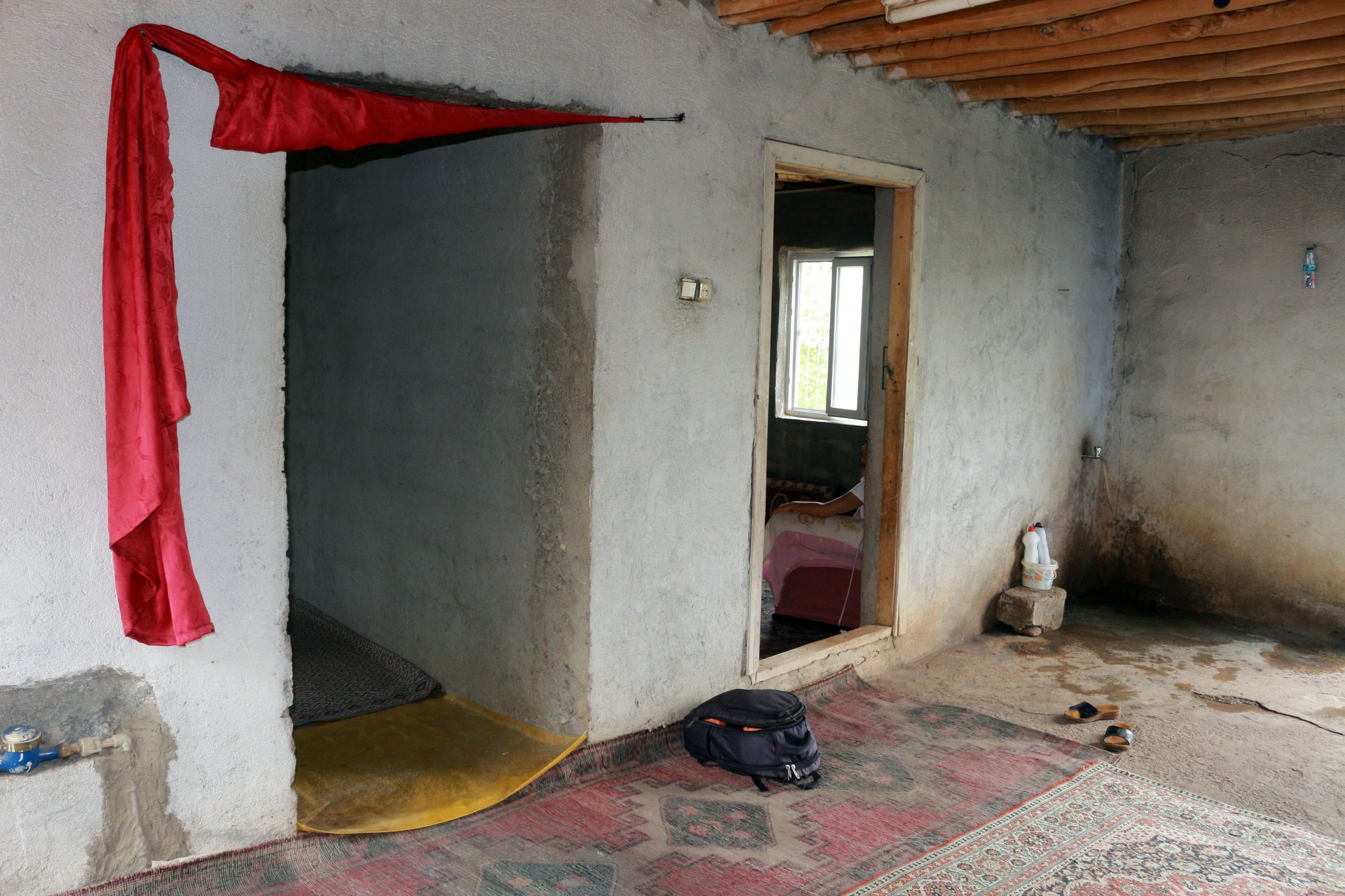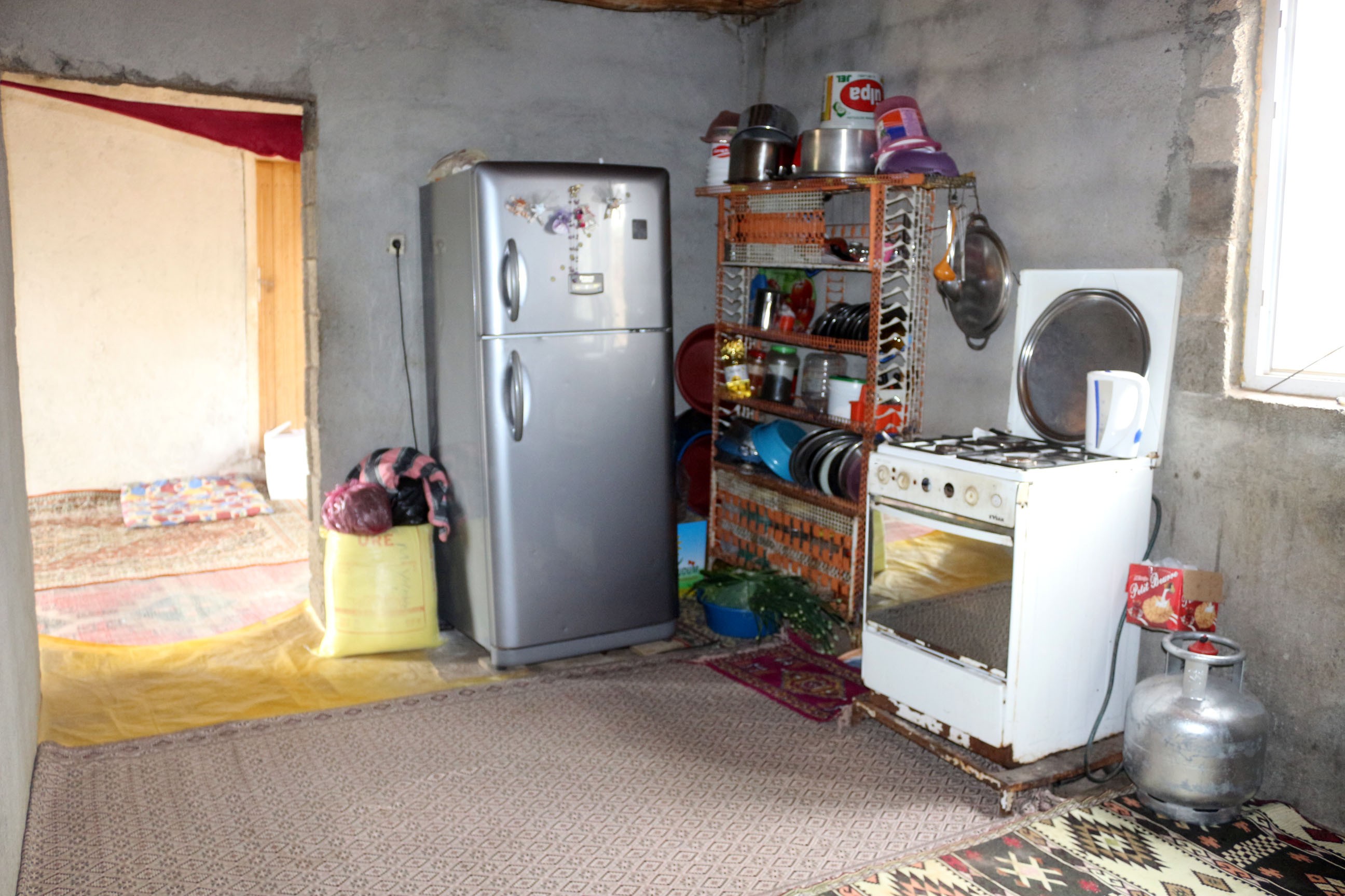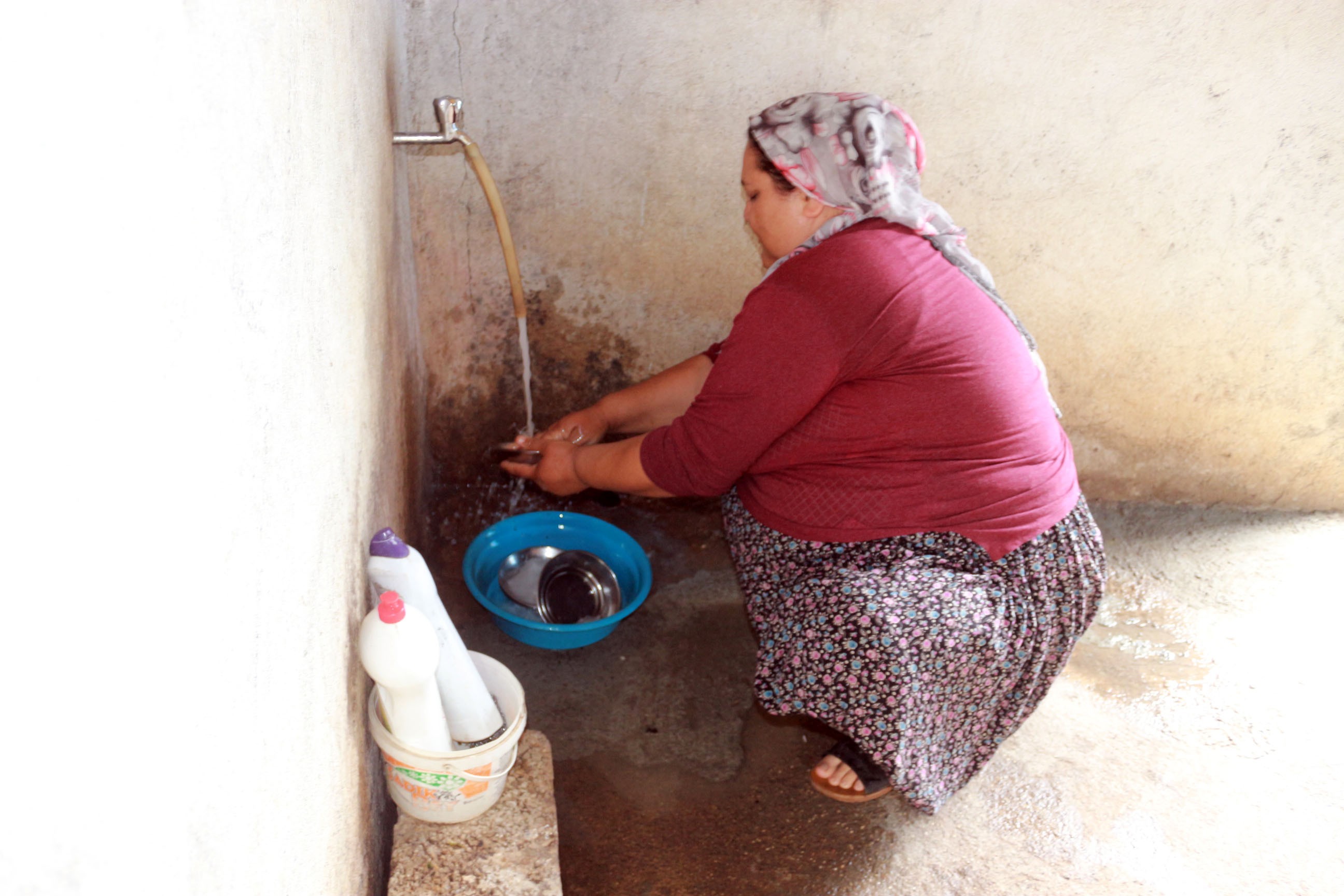 Üç kişilik aile, evin mutfak tezgahı ve banyosu olmadığı için evin koridor kısmında hem banyo yapmak hem de bulaşıklarını yıkamak zorunda kalıyor.