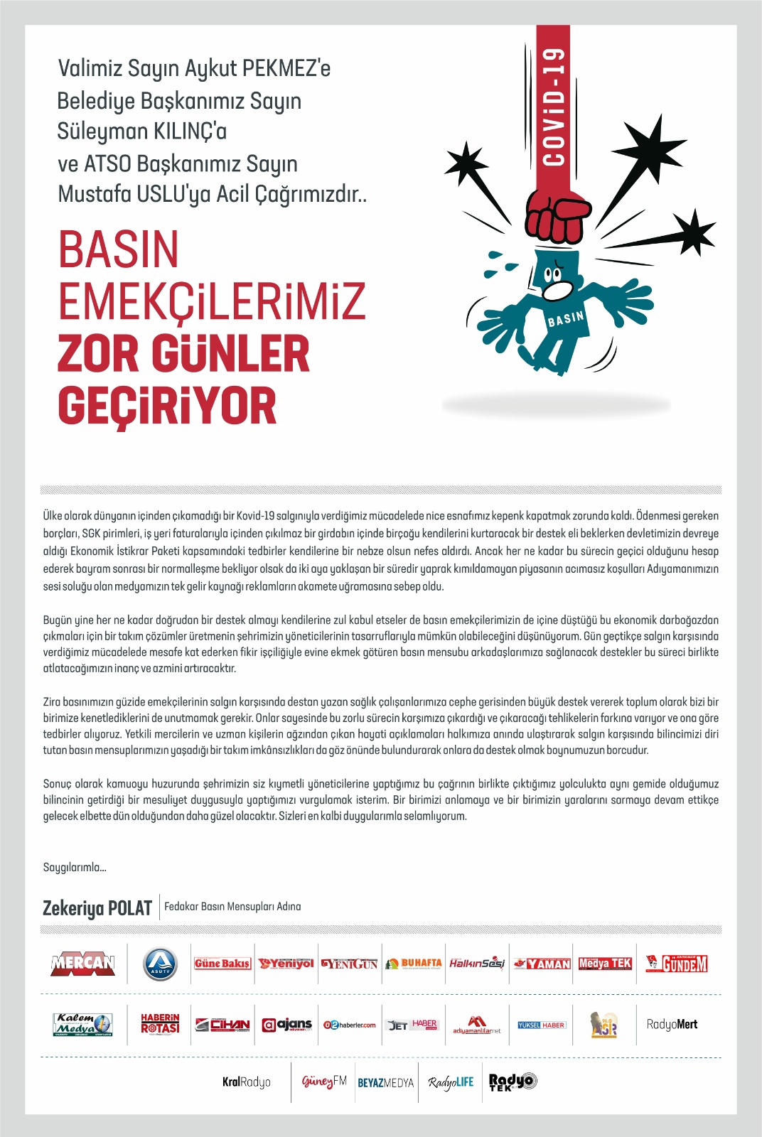 Ülke olarak dünyanın içinden çıkamadığı bir Kovid-19 salgınıyla verdiğimiz mücadelede nice esnafımız kepenk kapatmak zorunda kaldı. Ödenmesi gereken borçları, SGK pirimleri, iş yeri faturalarıyla içinden çıkılmaz bir girdabın içinde birçoğu kendilerini kurtaracak bir destek eli beklerken devletimizin devreye aldığı Ekonomik İstikrar Paketi kapsamındaki tedbirler kendilerine bir nebze olsun nefes aldırdı. Ancak her ne kadar bu sürecin geçici olduğunu hesap ederek bayram sonrası bir normalleşme bekliyor olsak da iki aya yaklaşan bir süredir yaprak kımıldamayan piyasanın acımasız koşulları Adıyamanımızın sesi soluğu olan medyamızın tek gelir kaynağı reklamların akamete uğramasına sebep oldu.
