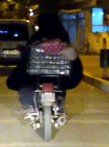 Adıyaman'da iki ilginç görüntü kameralara yansıdı. Adıyaman Atatürk Bulvarı üzerinden Sağlık Ocağı Caddesi'ne giren ve amatör kameralar tarafından kaydedilen ilk görüntüde, motosikletteki anne babanın bebeklerini meyve kasasıyla taşıdığı görüldü. Motosikletin arkasına sabitlenen meyve kasasının içerisine bebeklerini koyan anne baba, yola bu şekilde devam etti.