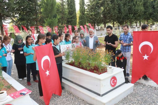 Adıyaman’da minik öğrenciler, TSK tarafından Suriye’de başlatılan ‘Barış Pınarı Harekatı'na katılan askerler ve şehitler için şehitlikte dua etti.