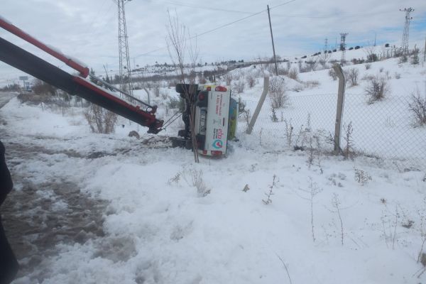 Adıyaman’ın Gölbaşı ilçesinde yağan kardan dolayı mobil EBA aracı kayarak devrildi.