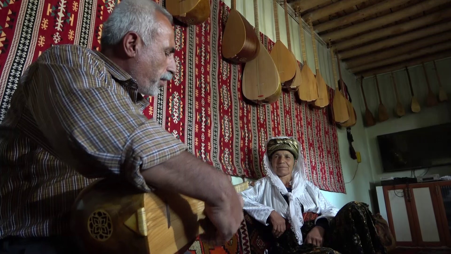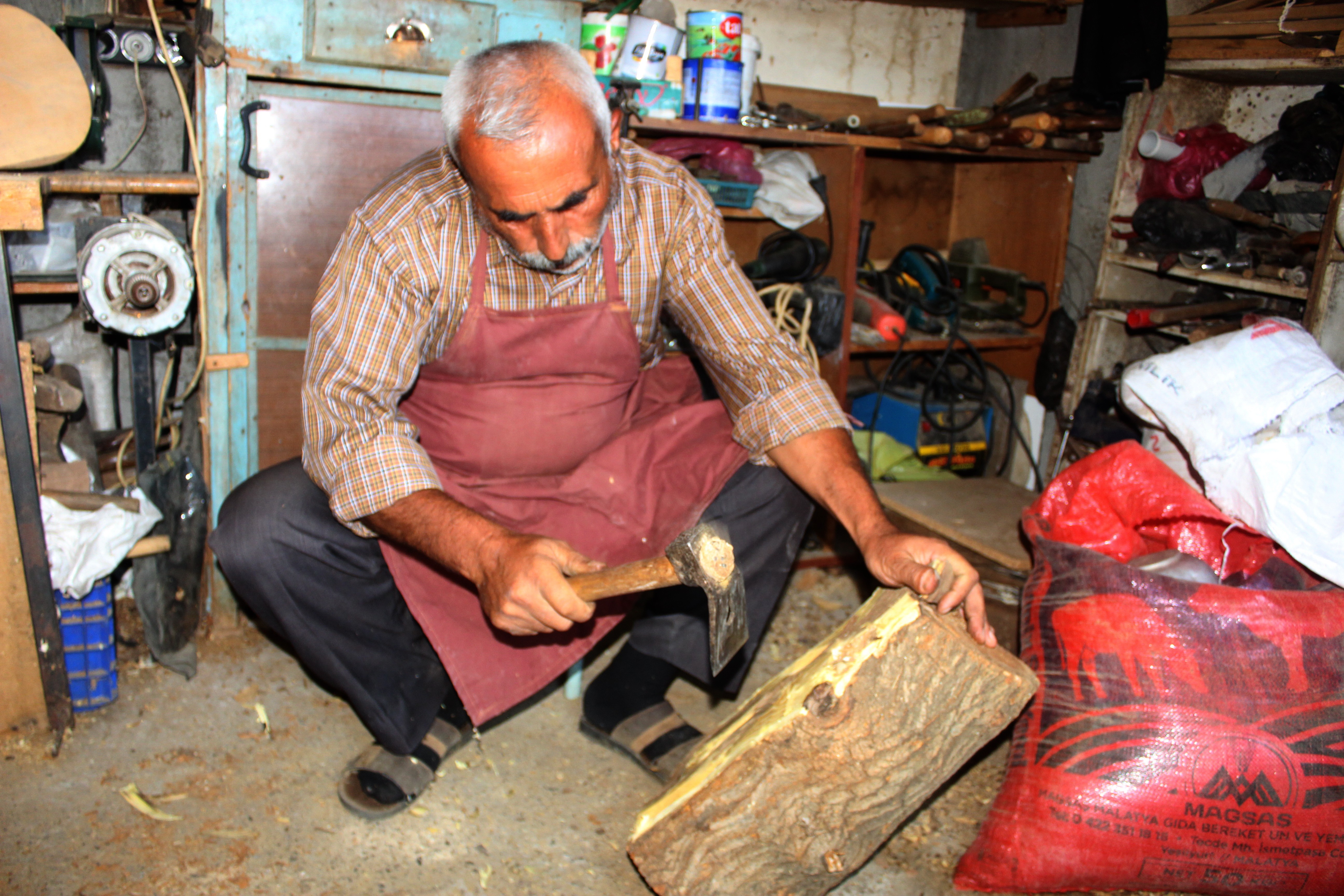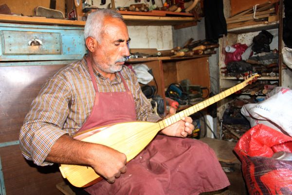 Adıyaman’da 7 yaşından beri saz yapıp çalan Hüseyin İsot, 4 metrekarelik atölyesinde teknolojinin imkanlarından faydalanmadan odunlara şekil verip saz yapıyor.
