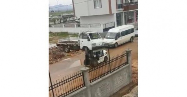Adıyaman'da, forklift ile taşınarak götürülen bir kamyoneti gören vatandaşlar adeta gözlerine inanamadı.