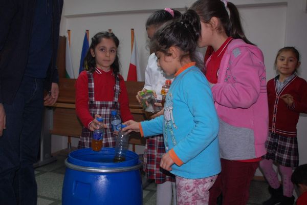 Yapılan konuşmaların ardından öğrenciler evlerinden getirdiği atık yağları, atık yağ bidonlarına boşalttı.