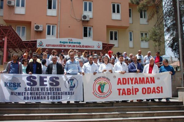 Tabipler Odası Adıyaman Şubesi Genel Sekreteri Dr. Ali İhsan Gündoğdu, “ASM’de çalışan aile hekimi, hemşire, ebe, sağlık memuru ve diğer sağlık çalışanlarının çoğu, kendilerine haksızca, hukuksuzca dayatılan Cumartesi günleri fazladan çalışmaya karşı haklarını korumak için Cumartesi günleri ASM’lerini açmayarak 5 aydır başarılı bir direniş sergilemektedirler. Sağlık Bakanlığı, birinci basamak sağlık çalışanlarının tüm yurtta haftada 40 saat çalışma sürelerini artıran uygulamalara karşı sürdürdüğü başarılı direnişini kırmaya yönelik 16 Nisan 2015 tarihinde yeni bir Aile Hekimliği Ödeme ve Sözleşme Yönetmeliği yayınlamıştır. Bu yönetmelik değişikliğiyle Cumartesi günleri direniş yapan sağlık çalışanlarına verilen ceza puanları 4 kat artırılmış, hakkını arayan çalışanları anında işten atma tehdidi hayata geçirilmiştir. Ayrıca yapılan yönetmelik değişikliği ile dünyada eşi benzeri görülmemiş keyfi, istismara açık (verilen diğer görevi yapmamak 10 puan, afişleri usulüne uygun asmamak 5 puan, nöbetlere gelmemek 20 puan vs) 35 ayrı uygulama kriteri ve bunun karşılığında ceza puanları getirilerek, sözleşme fesihleri (2 yıl içinde 100 ceza puanı almak fesih nedeni sayılmaktadır) yani işten atılmalar kolaylaştırılmış, iş güvencesi tamamen ortadan kaldırılmış; fazla çalıştırma, angarya görevlere karşı direnenlere aba altından sopa gösterilmiştir. Mevcut Aile Hekimliği Yasası ve buna bağlı yayınlanan yönetmeliklere dayanılarak uygulanan ağır çalışma koşulları ve baskıcı tutum karşısında, çalışanların Aile Sağlığı Merkezlerinde ve Toplum Sağlığı Merkezlerinde çalışmaya dayanacak hali kalmamıştır. ASM ve TSM çalışanları, kendilerine dayatılan her türlü haksız ve hukuksuz uygulamaya karşı yaklaşık 2 yıldır seslerini soluklarını çıkarmaya çalışmaktadırlar. Bunun için, yargıya başvurmuş, bakanlıkla görüşmeler gerçekleştirmiş, birçok basın açıklaması yapmış, mitingler düzenlemiş, iş bırakma dahil birçok demokratik hak arama yöntemleriyle sesini duyurmaya çalışmıştır. Ancak maalesef birinci basamak çalışanlarının haklı feryadına Sağlık Bakanlığımızın yanıtı hep tehdit ve sopa olmuştur. Sağlık Bakanlığı, sağlık hizmet alanını yeniden düzenlerken, toplumun sağlık gereksinimlerinden ziyade, sağlık piyasasının ihtiyacına göre politikalar belirleyip, uygulamakla, halkın eşit, ücretsiz, ulaşılabilir iyi sağlık hizmet alma hakkını gasp edip, sağlık çalışanlarının temel haklarını tırpanlamaya çalışmaktadır. Birinci basamak sağlık çalışanları, Cumartesi günleri fazla çalışmaya kaynaklık eden yasal düzenlemelerin ve iş güvencesini tamamen ortadan kaldıran, çalışma koşullarını ağırlaştıran, tahammülsüz kılan ödeme ve sözleşme yönetmeliğinin tamamen geri çekilmesini talebiyle 20-21-22 Mayıs günleri iş üretmeyecektir. Haklı taleplerin kamuoyu ile paylaşılması, karşılık bulması için çaba içinde olan birinci basamak sağlık çalışanları, haklarını korumak için uyarı niteliğinde iş bırakma eylemi yapma dışında çaresi kalmamıştır.